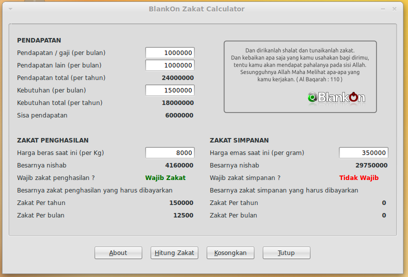 BlankOn Zakat Kalkulator akan turut menghiasi pada Distro BlankOn Rote yang saat ini masih dalam tahap pengembangan, dan akan di sertakan secara default pada BlankOn Sajadah 8.0. (jadi mohon bersabar ya.. untuk mencobanya, hehe.. :D), juga buat rekan-rekan bule jangan khawatir, ada juga dengan versi bahasa inggrisnya. mungkin software ini masih jauh dari kesempurnaan. tapi semoga apa yg dihasilkan bisa bermanfaat bagi kita semua. tak lupa kritik dan sarannya dari pak kyai, pak Ustadz, bang Haji